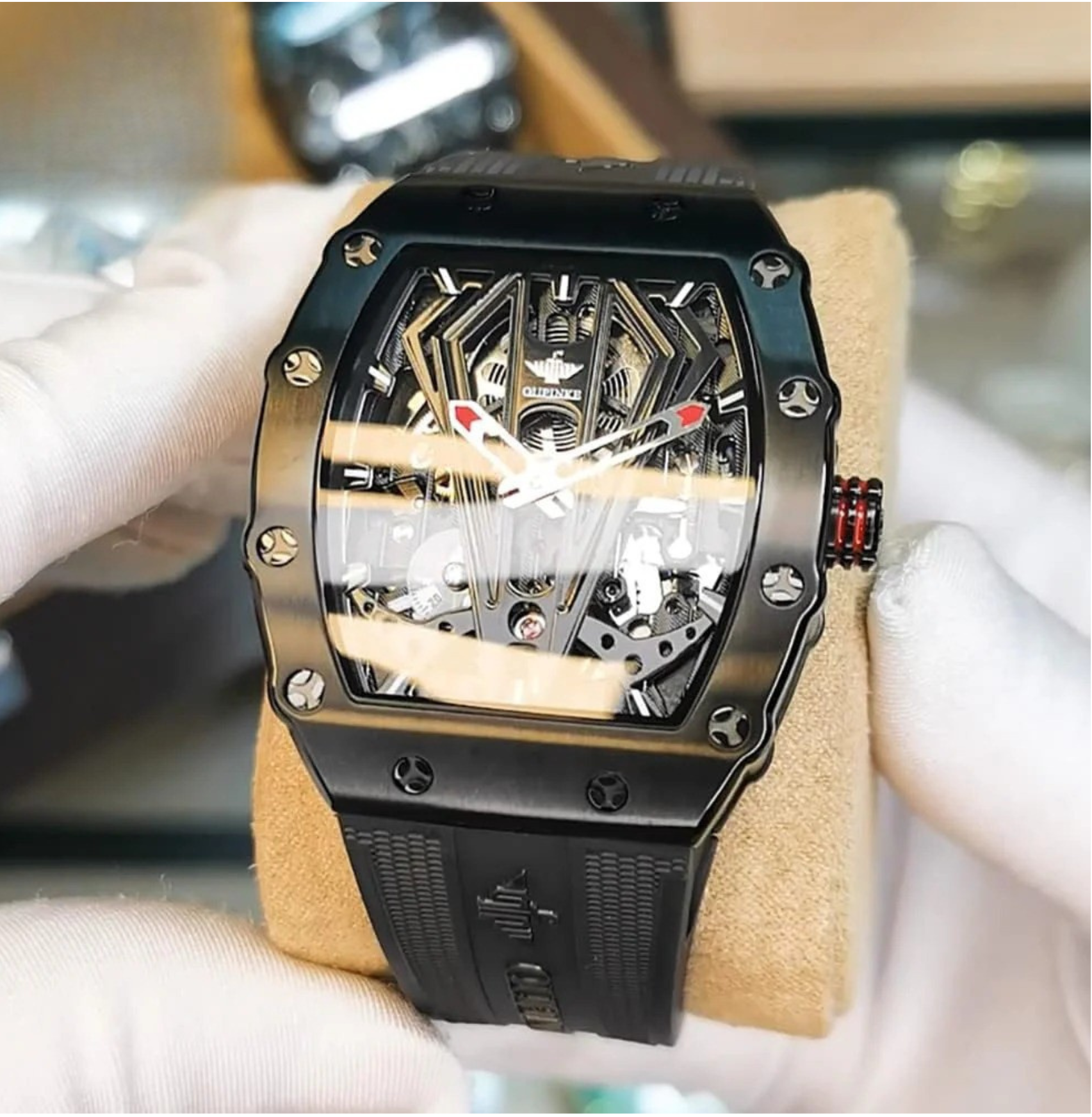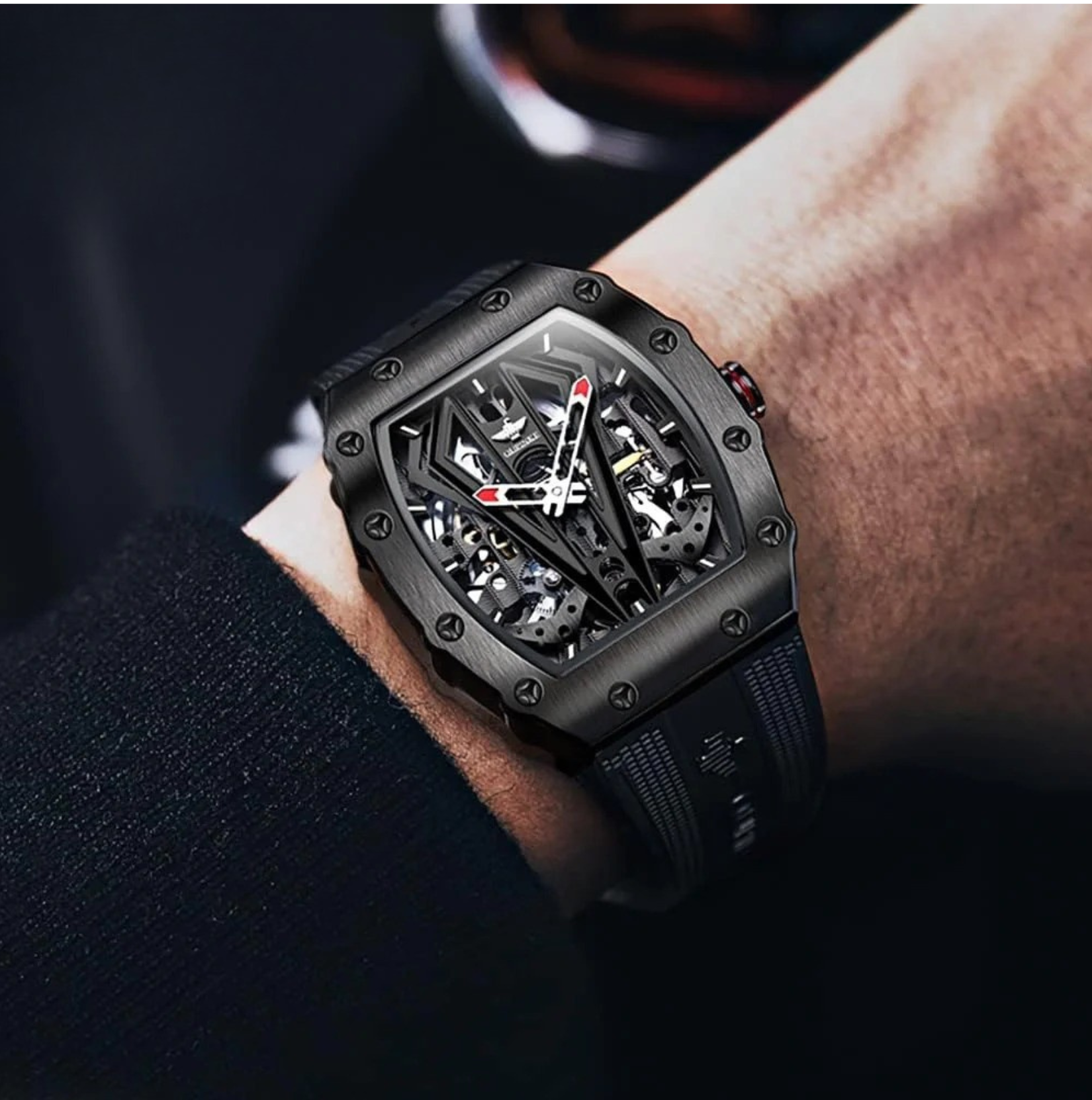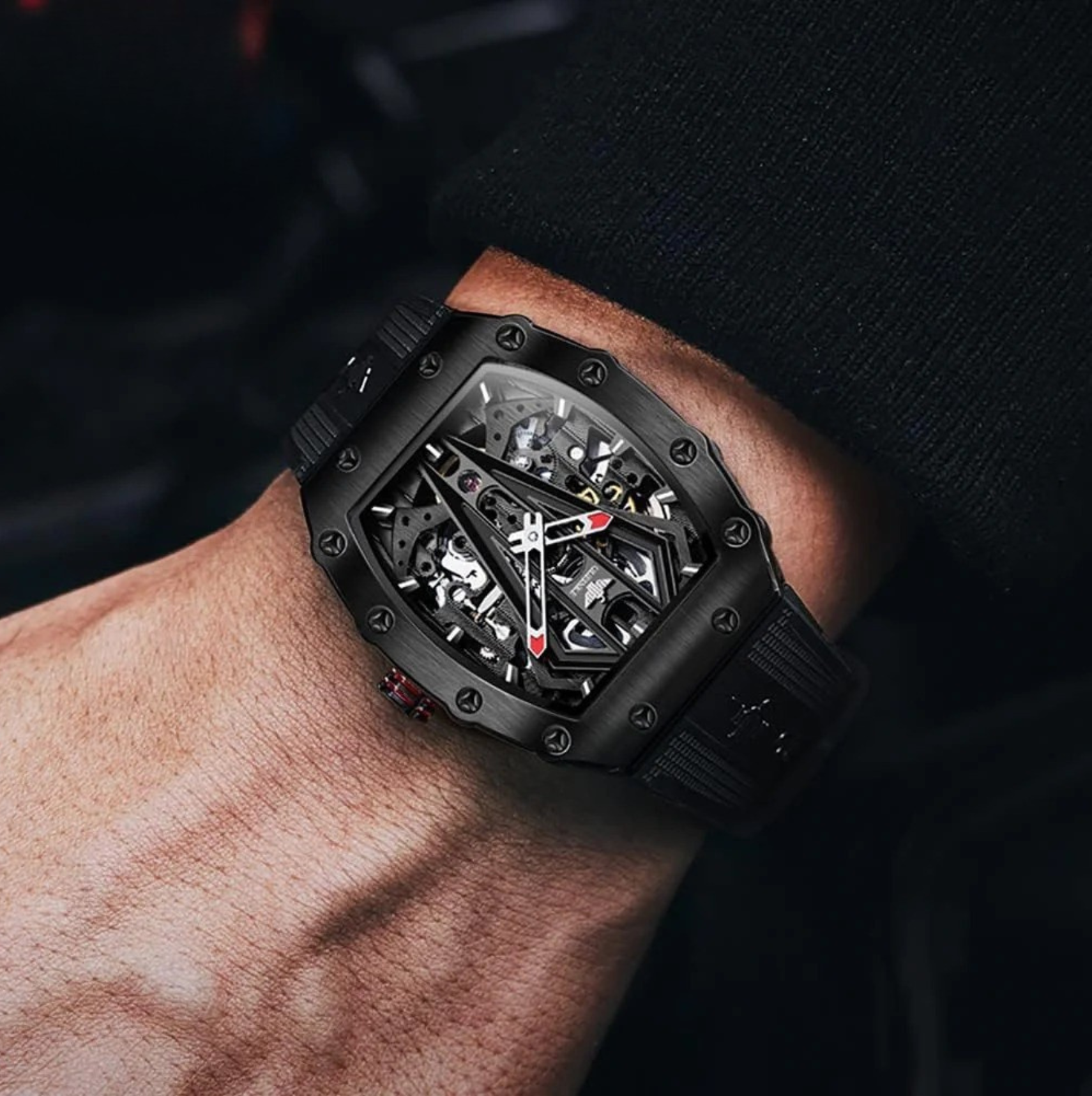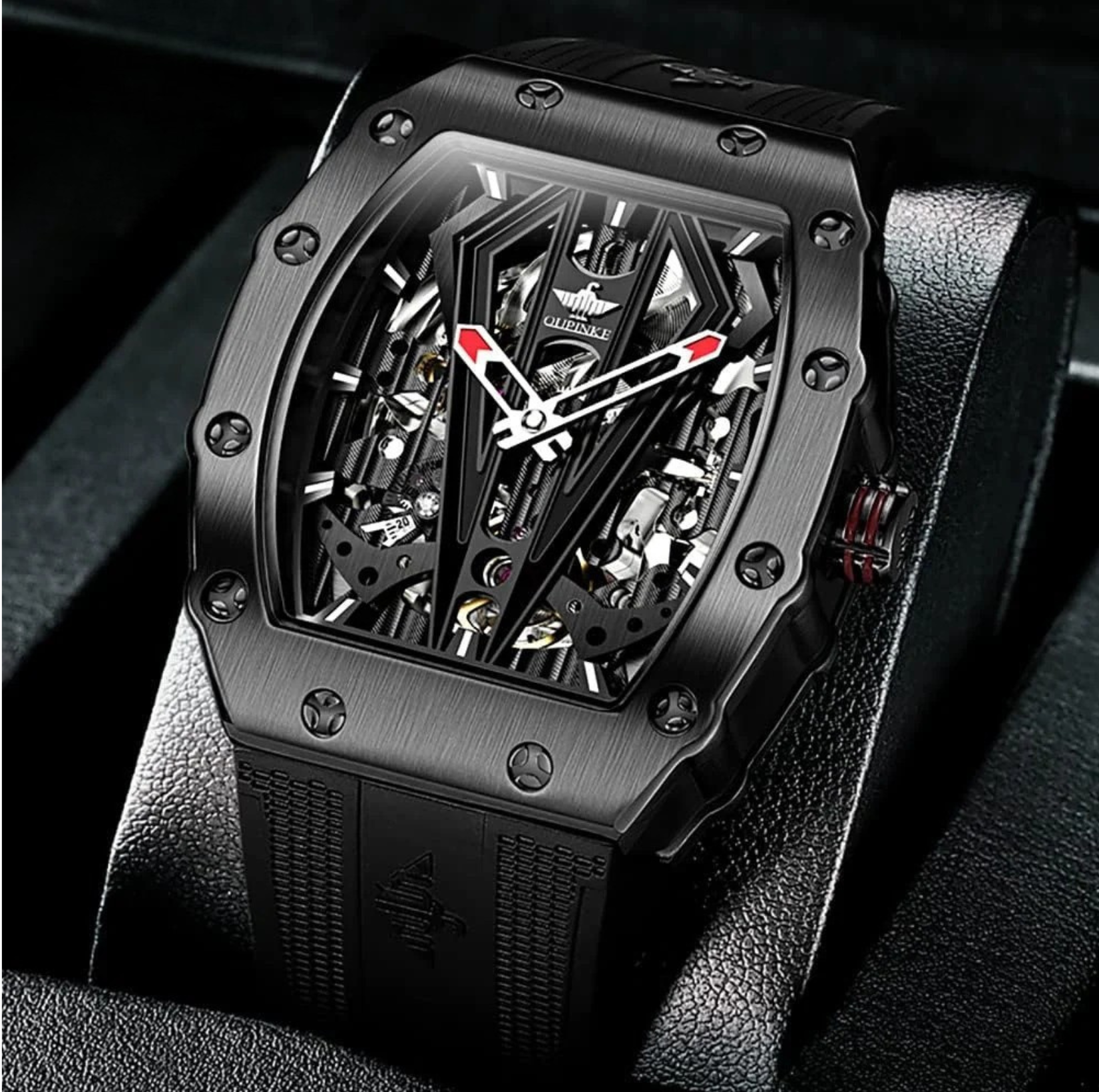 The OUPINKE Skeleton is a masterpiece of engineering and design. Its striking, black toned case with exposed mechanical movement showcases the artistry of horology, while the geometric dial gives it a modern, powerful edge.